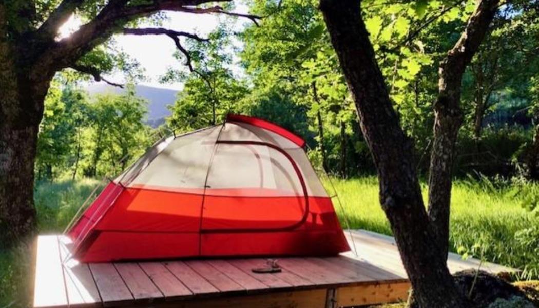 Conçue et réalisée par V-Lodges, elle se compose de trois platelages en bois pour y installer sa tente ou dormir une nuit à la belle étoile. (capacité maximum de 6 personnes)