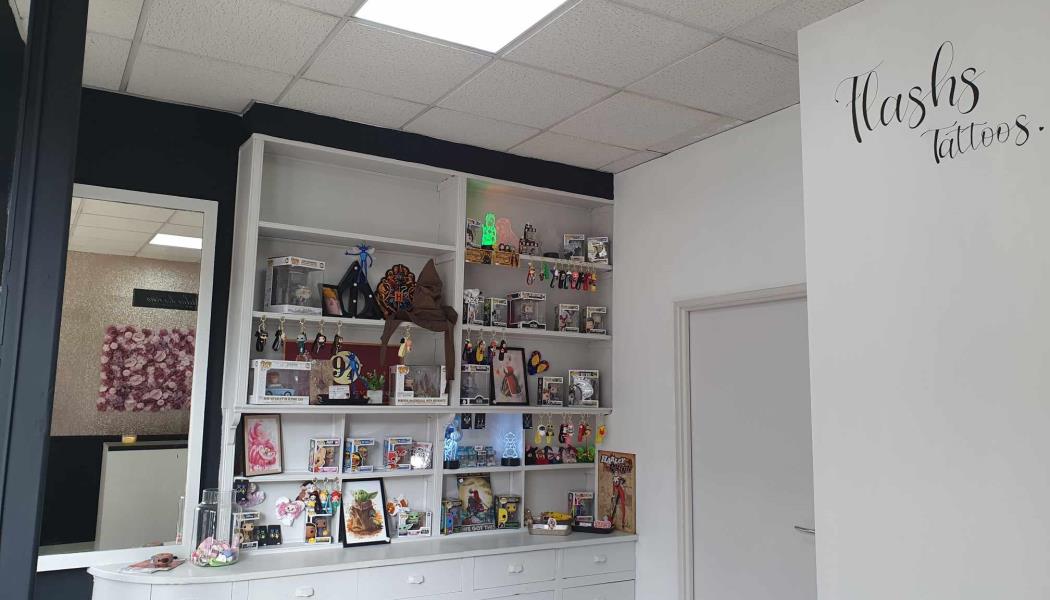 Salon de piercing, vente de goodies en tout genre (bijoux fantaisie, faux ongles, porté clés, cartes diverses...).